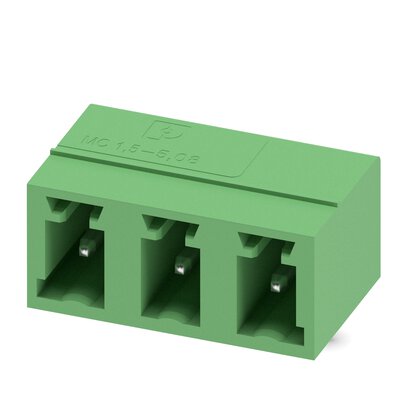 Description: PCB headers, nominal cross section: 1.5 mm2, color: green, nominal current: 8 A, rated voltage (III/2): 320 V, contact surface: Tin, type of contact: Pin, number of potentials: 3, number of rows: 1, number of positions: 3, number of connections: 3, product range: MC 1,5/..-G, pitch: 5.08 mm, mounting: Wave soldering, pin layout: Linear pinning, solder pin [P]: 3.4 mm, number of solder pins per potential: 1, plug-in system: COMBICON MC 1,5, Pin connector pattern alignment: Standard, locking: without, mounting: without, type of packaging: packed in cardboard