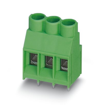 Description: PCB terminal block, nominal current: 32 A, rated voltage (III/2): 630 V, nominal cross section: 4 mm2, number of potentials: 3, number of rows: 1, number of positions per row: 3, product range: MKDS 5, pitch: 6.35 mm, connection method: Screw connection with tension sleeve, mounting: Wave soldering, conductor/PCB connection direction: 0 °, color: green, Pin layout: Linear pinning, Solder pin [P]: 5.1 mm, number of solder pins per potential: 1, type of packaging: packed in cardboard. The article can be aligned to create different nos. of positions!