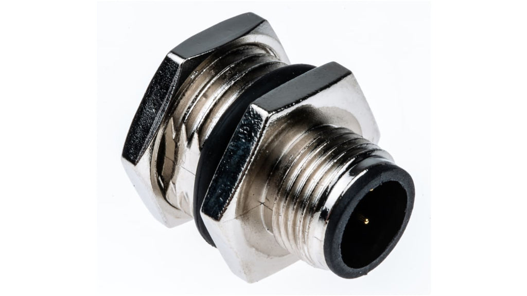 Description: TE Connectivity connector, male, M12 series, M12, 4-pin, Panel mount Alias: M12 Mtl MALE PNL CONN. Sldr Rear (Hex)