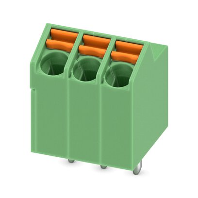 Description: PCB terminal block, nominal current: 9 A, rated voltage (III/2): 200 V, nominal cross section: 1 mm2, number of potentials: 3, number of rows: 1, number of positions per row: 3, product range: SPTA 1/, pitch: 3.5 mm, connection method: Push-in spring connection, mounting: Wave soldering, conductor/PCB connection direction: 65 °, color: green, Pin layout: Linear pinning, Solder pin [P]: 3.5 mm, number of solder pins per potential: 1, type of packaging: packed in cardboard