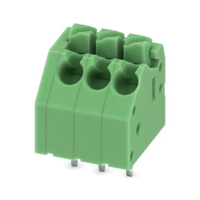 Description: PCB terminal block, nominal current: 8 A, rated voltage (III/2): 250 V, nominal cross section: 1.5 mm2, number of potentials: 3, number of rows: 1, number of positions per row: 3, product range: PTSA 1,5, pitch: 3.5 mm, connection method: Push-in spring connection, mounting: Wave soldering, conductor/PCB connection direction: 45 °, color: green, Pin layout: Linear pinning, Solder pin [P]: 3.5 mm, number of solder pins per potential: 1, type of packaging: packed in cardboard. Soldering legs in front area, one-rowed