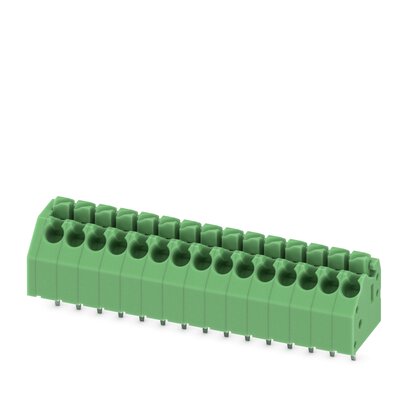 Description: PCB terminal block, nominal current: 8 A, rated voltage (III/2): 250 V, nominal cross section: 1.5 mm2, number of potentials: 15, number of rows: 1, number of positions per row: 15, product range: PTSA 1,5, pitch: 3.5 mm, connection method: Push-in spring connection, mounting: Wave soldering, conductor/PCB connection direction: 45 °, color: green, Pin layout: Linear pinning, Solder pin [P]: 3.5 mm, number of solder pins per potential: 1, type of packaging: packed in cardboard. Soldering legs in front area, one-rowed