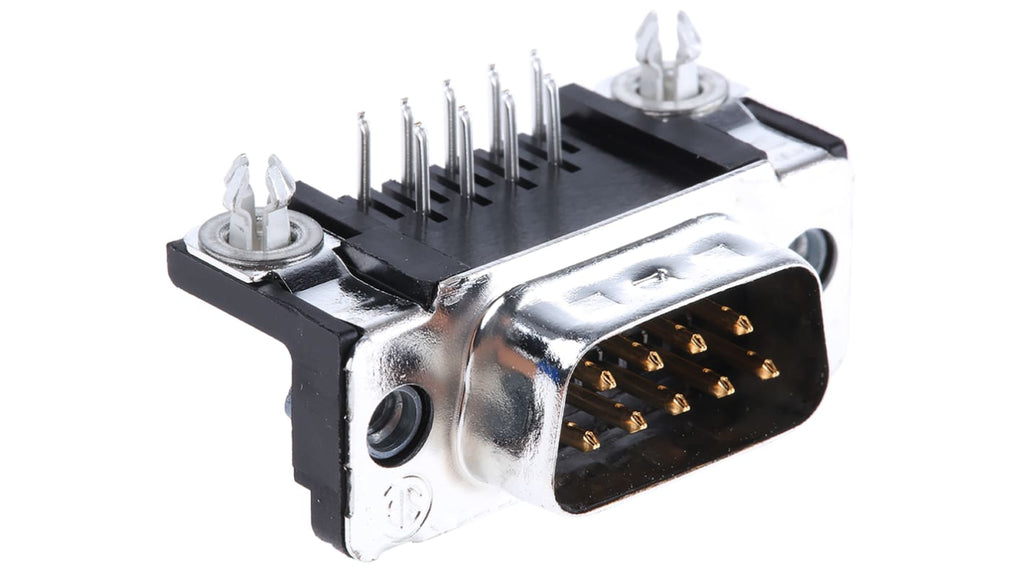 Description: PCB D-Sub Connectors, Plug, Board-to-Board, 9 Position, 2.74 mm [.108 in] Centerline, 2 Row, 1 Connector Shell Size, Round, Standard Profile Alias: HD-20 PLUG RA .318 FMS BD-LK 4