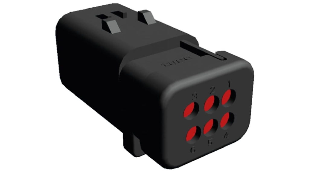 Description: Housing for Male Terminals, Wire-to-Wire, 6 Position, .177 in [4.5 mm] Centerline, Sealable, Red, Cable Mount (Free-Hanging), AMPSEAL 16 Alias: AS 16, 6P CAP ASSY, KEY 1